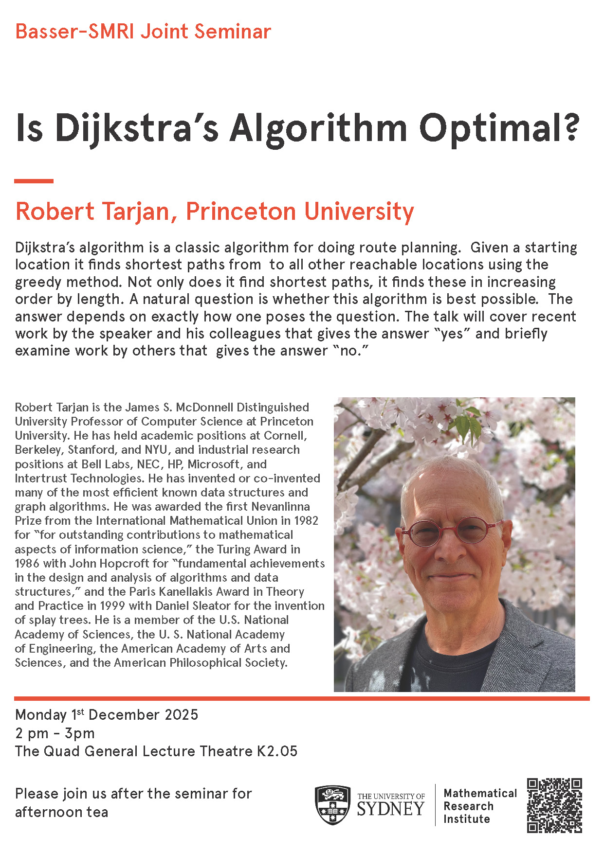 ‘Is Dijkstra’s Algorithm Optimal?’ – A Basser-SMRI Joint Seminar by Robert Tarjan