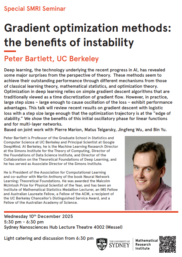 About the speaker: Peter Bartlett is Professor of the Graduate School in Statistics and Computer Science at UC Berkeley and Principal Scientist at Google DeepMind. At Berkeley, he is the Machine Learning Research Director at the Simons Institute for the Theory of Computing, Director of the Foundations of Data Science Institute, and Director of the Collaboration on the Theoretical Foundations of Deep Learning, and he has served as Associate Director of the Simons Institute. He is President of the Association for Computational Learning and co-author with Martin Anthony of the book Neural Network Learning: Theoretical Foundations. He was awarded the Malcolm McIntosh Prize for Physical Scientist of the Year, and has been an Institute of Mathematical Statistics Medallion Lecturer, an IMS Fellow and Australian Laureate Fellow, a Fellow of the ACM, a recipient of the UC Berkeley Chancellor’s Distinguished Service Award, and a Fellow of the Australian Academy of Science.
